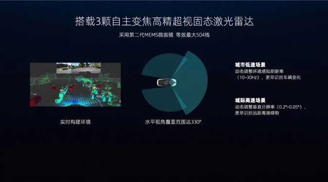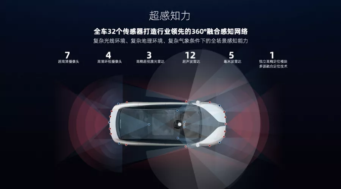 除此之外,还有5个毫米波雷达,12个超声波雷达,7个800万像素超高清摄像头和4个200万像素高清环视摄像头,其中高清摄像头最远探测距离超过600米,另外还有接近4K级像素的成像能力,可以形成360°全方位融合感知网络,能够高效分析处理复杂外界信息。