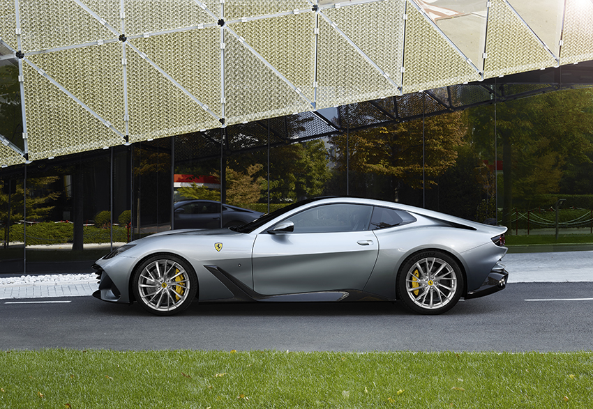 在侧面部分,可以看到比 GTC4 Lusso 更低的车身。多亏了这一点,引擎盖看起来更长,更灵活。为最大化车身比例和轮廓,全长增加了76mm,进一步强调了侧面线条的动感。