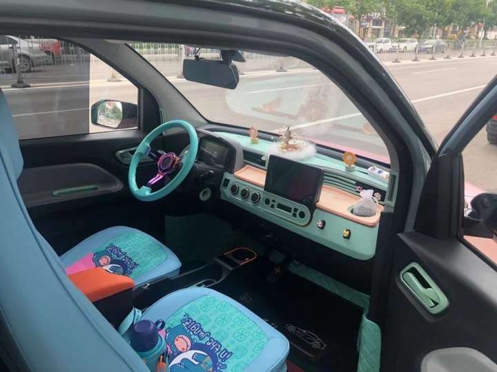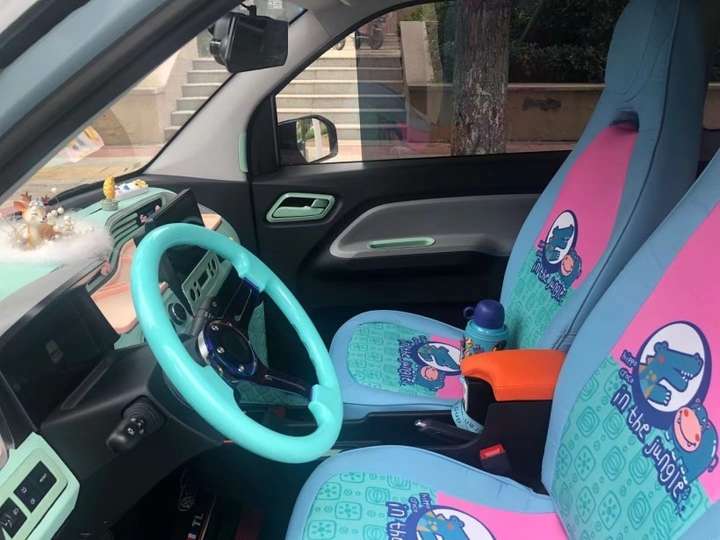 对于外观的改动,只贴了“美少女战士”车贴,对于内饰的改动就大了,五菱宏光MINIEV原车只有一块彩色液晶仪表盘,没有中控屏幕,我车上的这块中控屏幕是后期加装的,中控台饰板和方向盘也换成了我喜欢的蓝色装饰,座套是十分“卡哇伊”的红蓝相间卡通形象,所有改装共花了1000多块钱,虽然不多,但是整个内饰质感已经发生了很大改变。