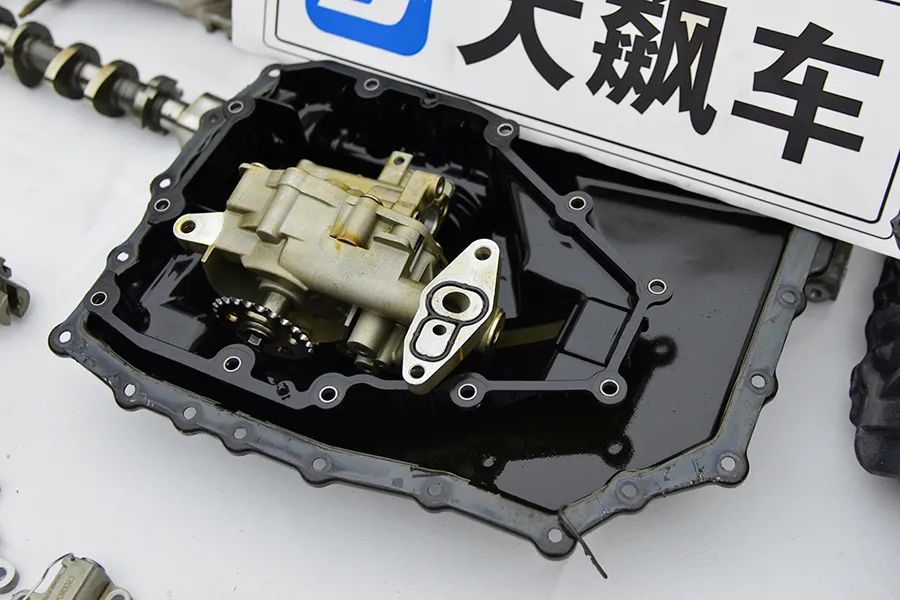 这台发动机的油底壳相当有意思,是国内首创的“双油底壳设计”,大油底壳的内部套着一个小油底壳。当车辆处于冷车状态时,小油底壳封闭,机油在小油底壳内部循环,由于油量少,所以升温快,利于暖机;当机油温度正常之后,阀门自动打开,让大小油底壳连通,机油进行大循环。原理和发动机水路散热的大循环、小循环类似。能将发动机润滑系统尽快提升到正常工作温度,延长发动机寿命,节省燃油,降低排放。