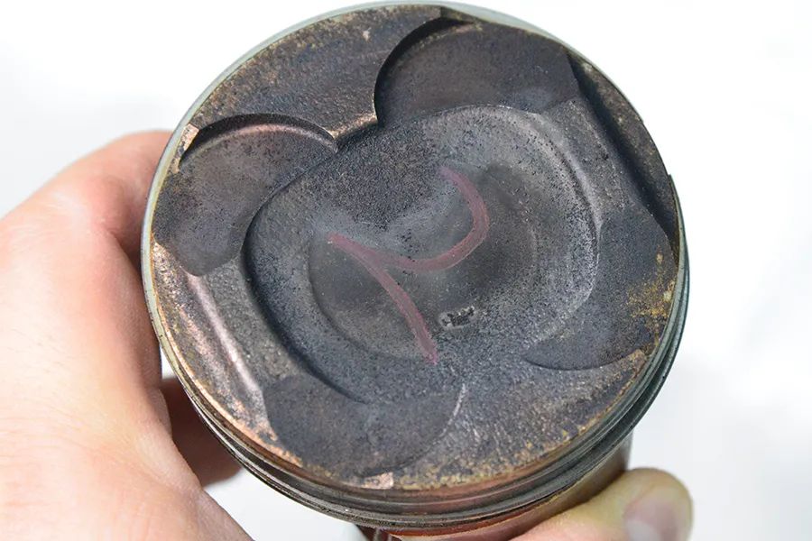 四个活塞顶端确实有一些积碳,但并没有太多,说明缸内混合气的燃烧还比较充分。
