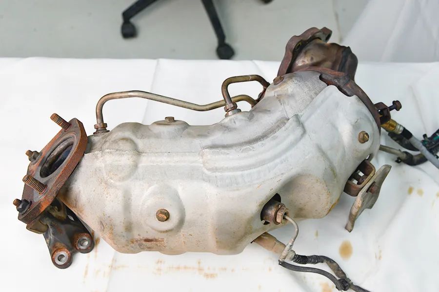 三元催化器是一块多孔陶瓷材料,安装在发动机排气前端,降低尾气排放的有害物质。参与催化反应的并不是陶瓷材料,而是附着在上面的一层铂、铑、钯等贵重金属和稀土涂层。