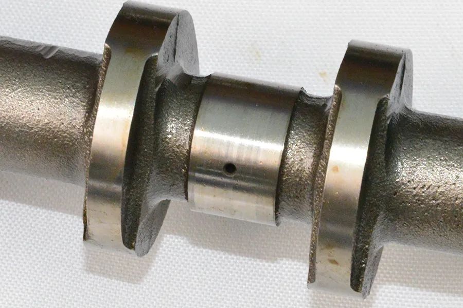 这辆车的曲轴轴瓦没有变色的情况,也就是说磨损正常,没有出现过度磨损的状况,对于一辆行驶超10万公里的车来说,已经很不错了。虽然出现了一些细小的磨损纹路,但曲轴整体看上去依旧光亮如新。
