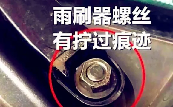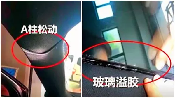 首先,嵇先生发现A柱是松动的,雨刷器螺丝有拧过痕迹,后视镜上的缝隙也非常大。最可怕得是,前挡风玻璃竟然是歪的,还有溢胶。