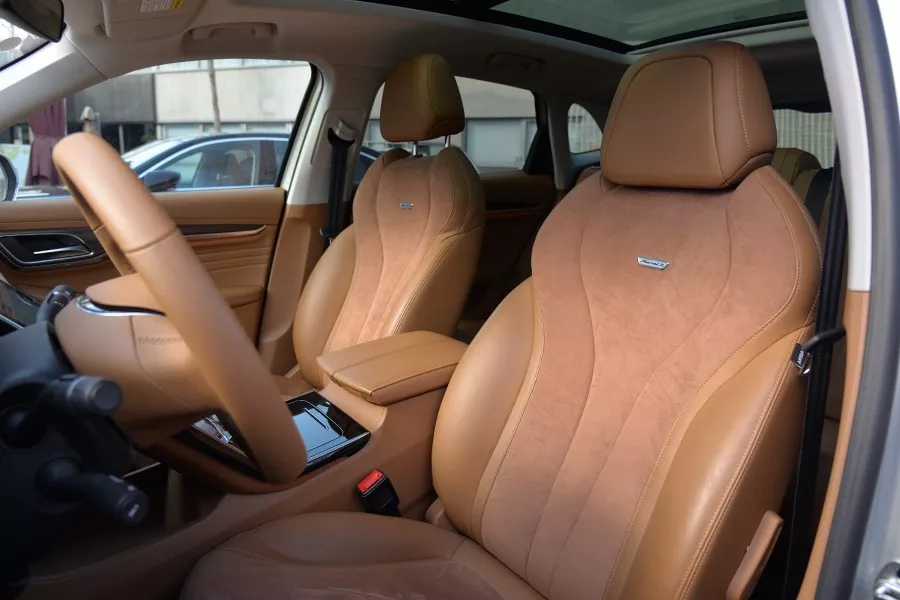 座椅是皮革、翻毛皮混搭包裹,整体舒适度不错,人体工程学设计也相对合理,能找到舒适的坐姿。这一点在国产自主品牌车型上,还是很难得的。另外,四个车门都设计有“开门预警灯”,乘客停车开门时,能警示后方是否有其它车辆,这个功能在国内复杂的交通环境中相当实用。