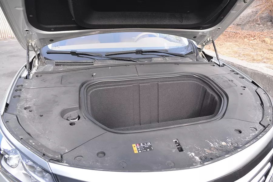 引擎盖打开之后有一个小型储物格,可以放置充电线或一些常用工具。