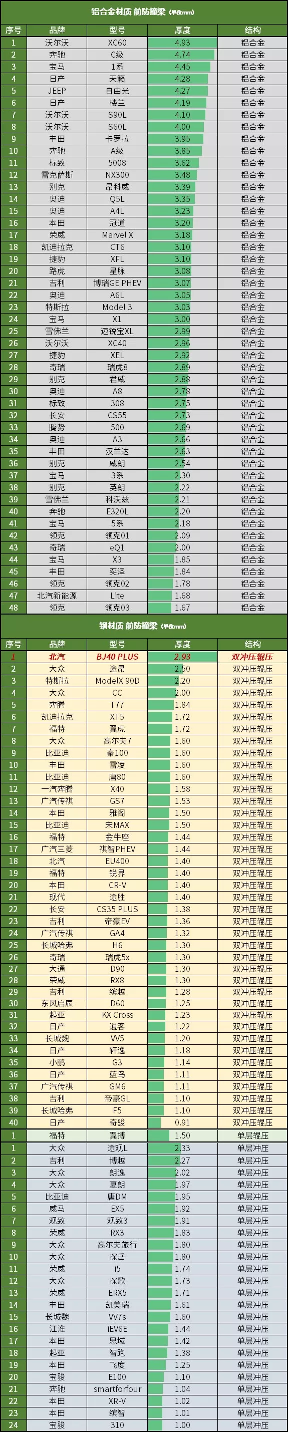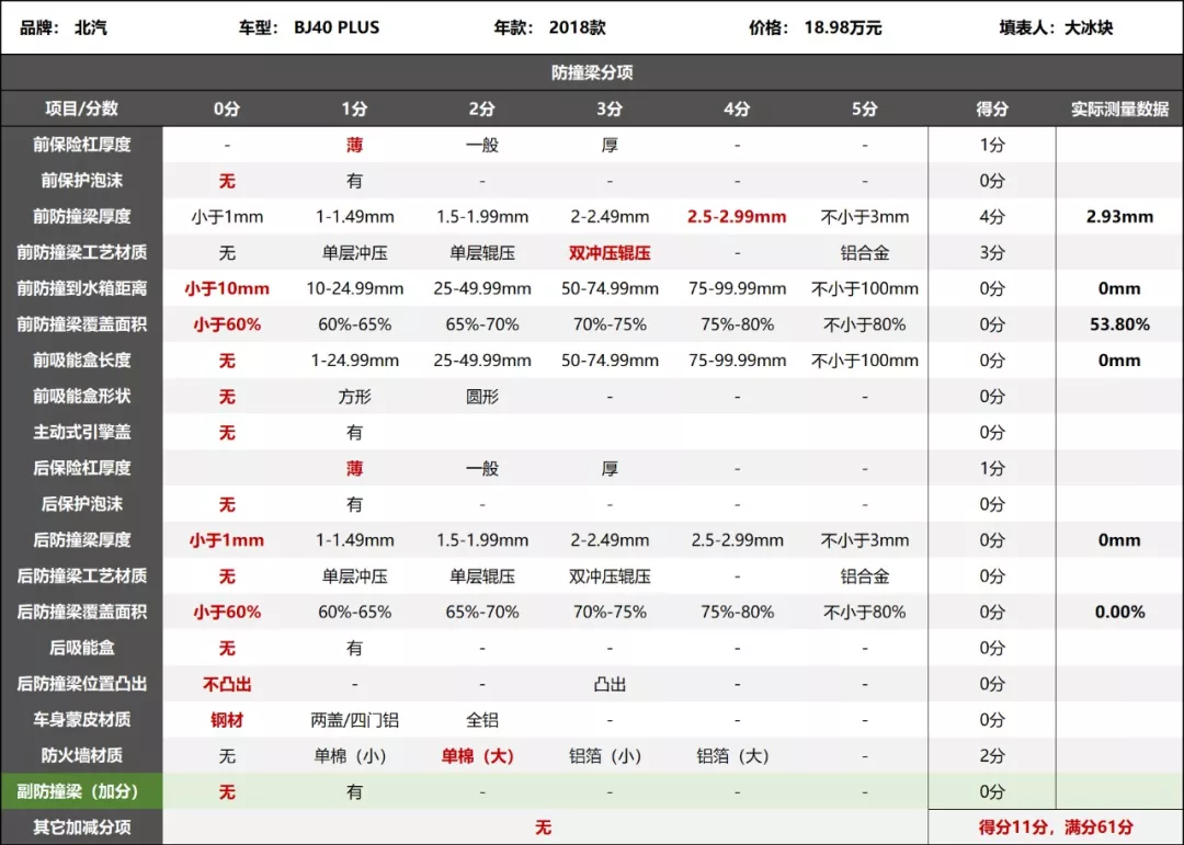 这辆非承载车身结构的BJ40,没有严格意义上的前防撞梁,只有一根圆管与车身纵梁相连。圆管“防撞梁”的厚度为2.93毫米,只能覆盖53.8%的范围。