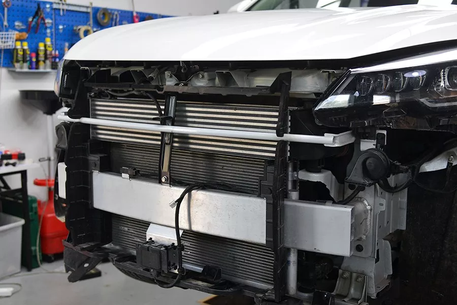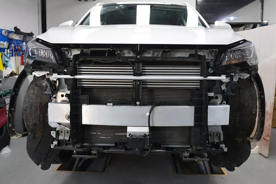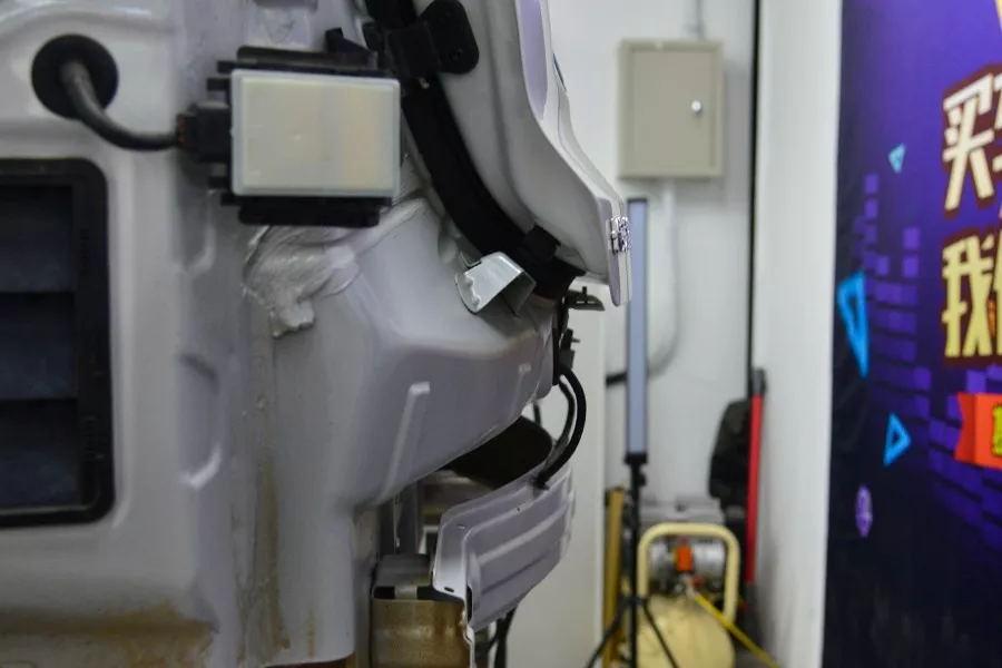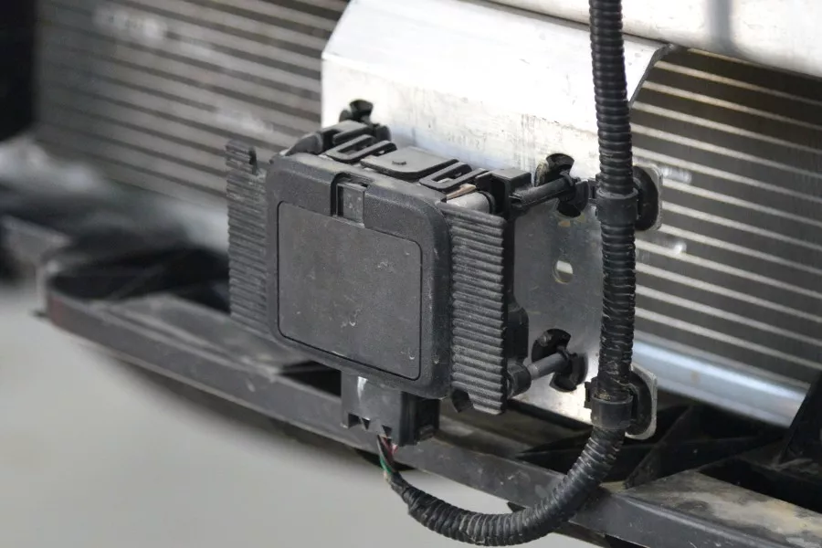 这辆车的ACC毫米波雷达是装在防撞梁延伸下来的支架上。说明这辆车在原始设计时并没有考虑雷达的安装位置,明显是后期加装的。虽然这种安装方式,在低速碰撞中容易造成雷达损坏。但幸运的是,这个固定支架仅仅是一层铝合金板,很容易弯曲。如果撞击不是很严重的话,还有一定的缓冲空间,比那种生怕撞不坏的坚固支架强一些。