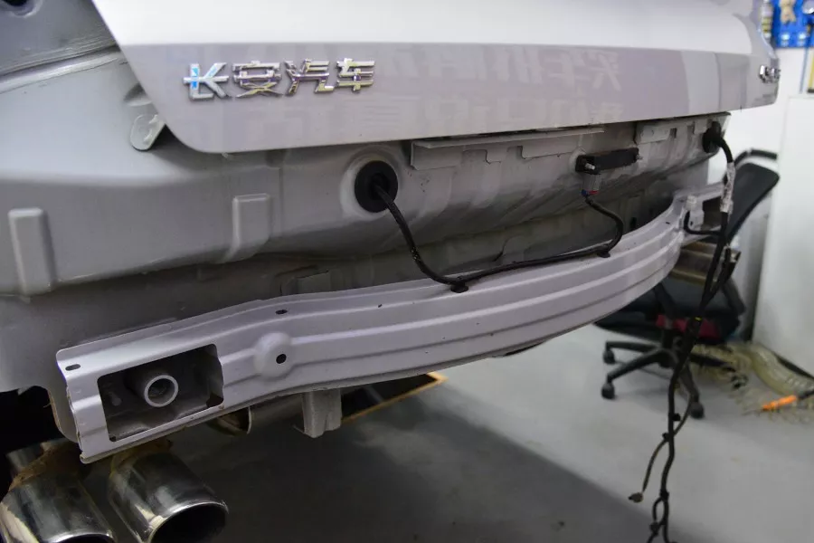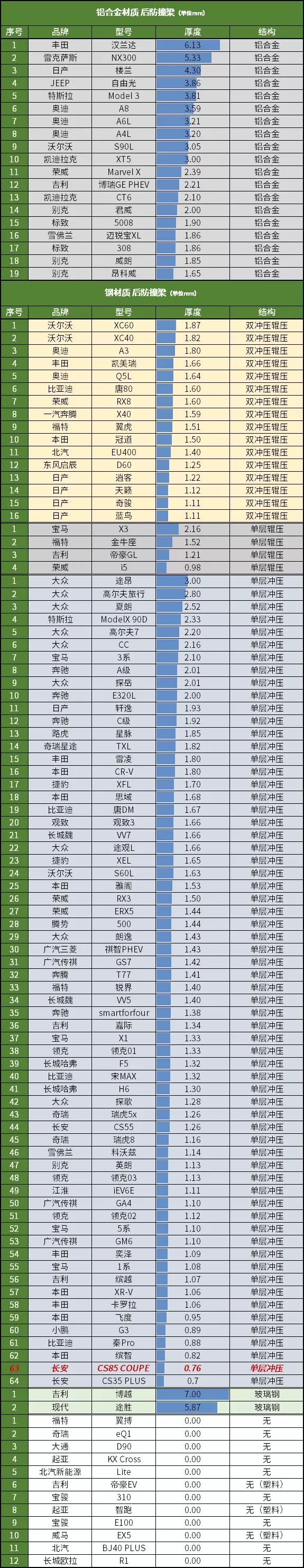 然而与前防撞梁形成鲜明对比的是,后防撞梁无论是用料还是结构,都与前面相距甚远。0.76毫米的钢板厚度,和CS35 PLUS差不多,都是相当的薄。真是前梁用料猛如虎,一看后梁就......我们估计这是和目前没有相关机构做追尾碰撞测试有关,缺乏第三方机构、媒体的监督、鞭策,导致一些厂家就不重视后防撞梁,有的甚至用塑料或者干脆就没有。