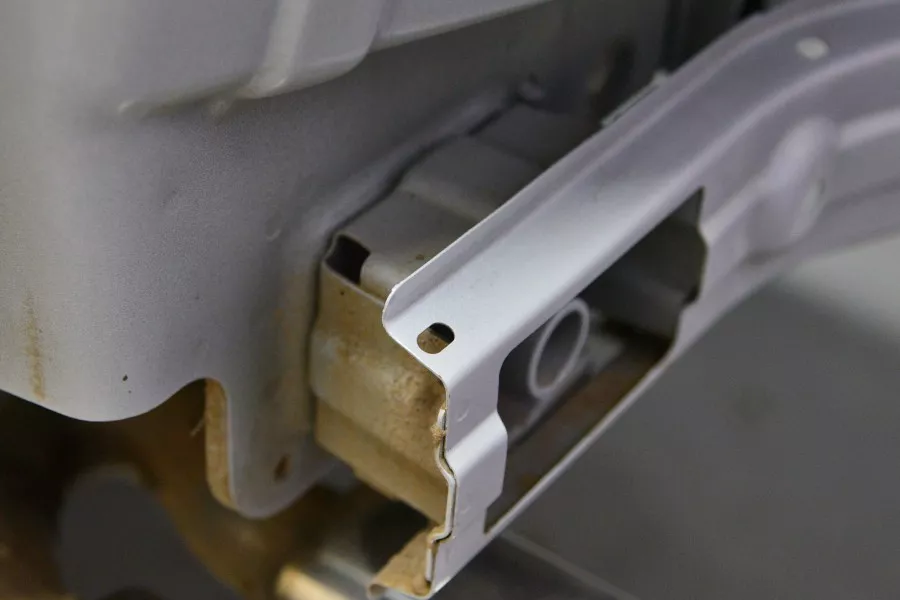 前吸能盒也是铝合金材质,不过没有相应的溃缩褶皱和打孔。但在纵梁上,不仅有溃缩褶皱,还有相应的打孔,与老式日系车,尤其是丰田比较相似。