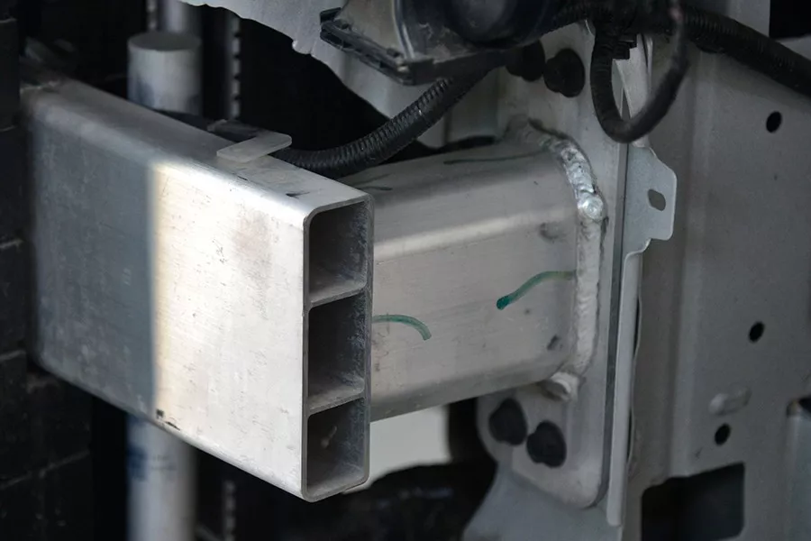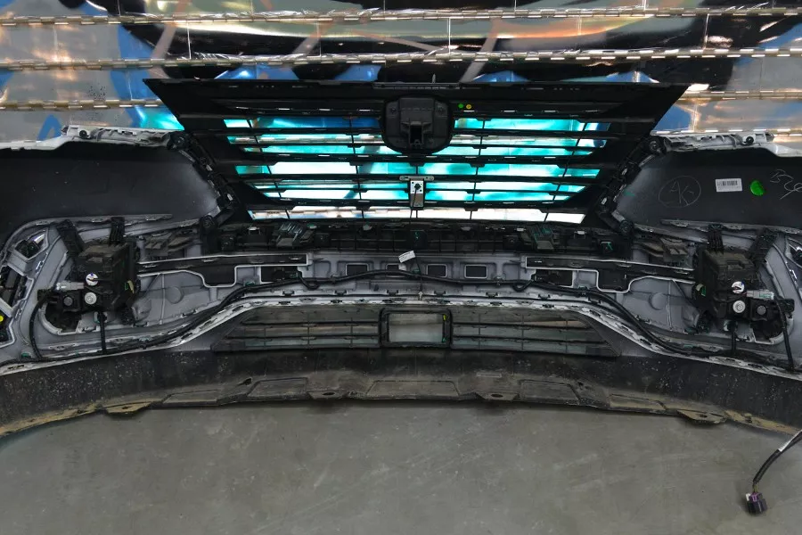 拆掉前保险杠,看到一根铝合金前防撞梁,厚度为2.86毫米,呈“目”字形,防撞梁宽度能覆盖到62.29%的范围。