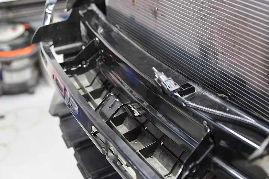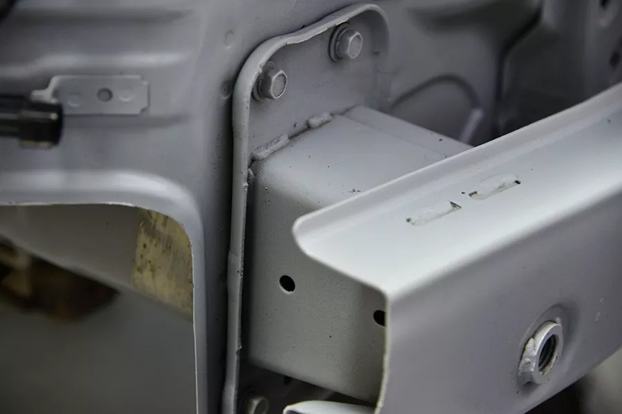 后吸能盒比较规范,安装螺丝齐全, 虽然没有相应的褶皱,但有溃缩打孔。