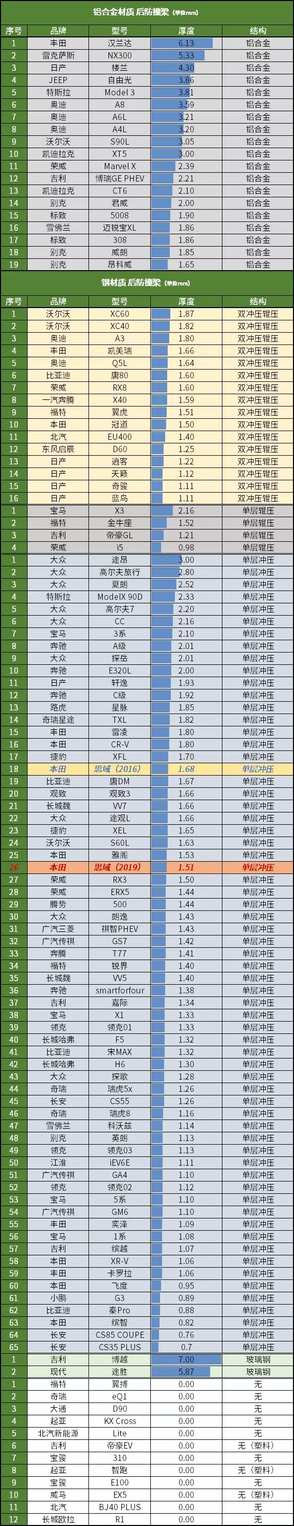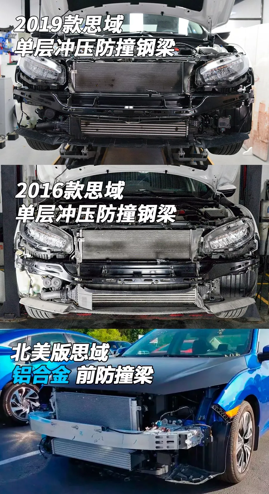 新款在防撞梁方面还是做了一些改变,比如“厚度”。和老款同样式、同材质的情况下,新款思域的防撞梁钢板厚度为1.27毫米,而老款为1.42毫米,薄了10%左右。