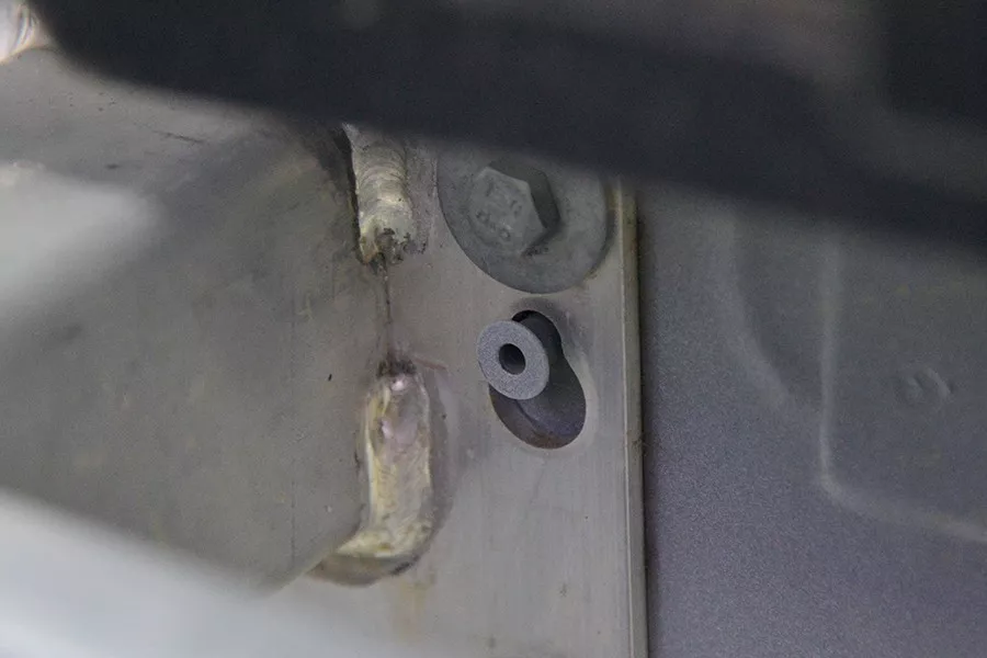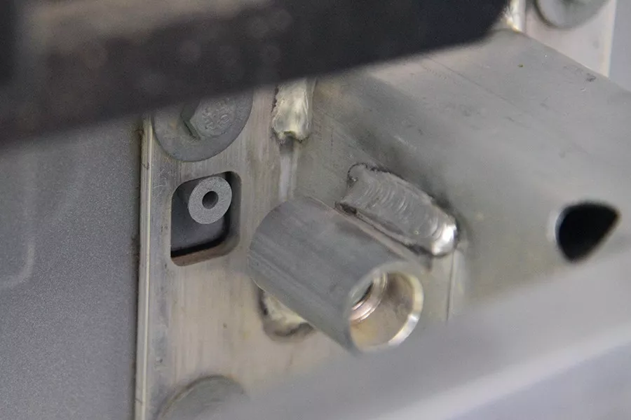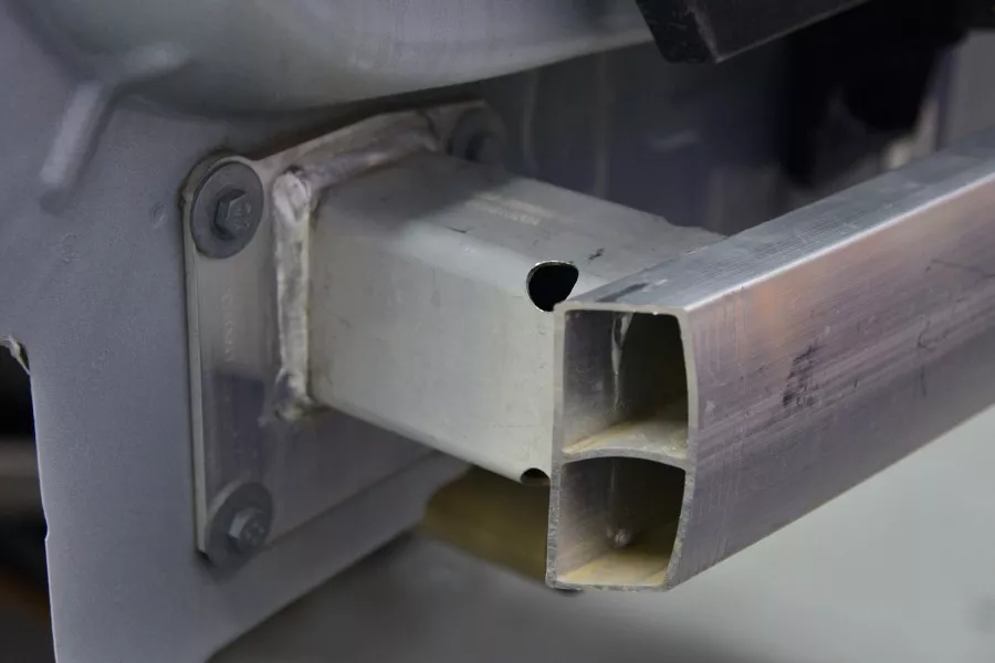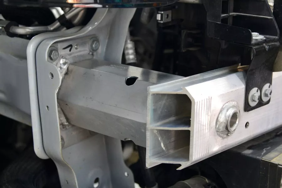 后吸能盒也是铝合金材质,结构为常见的方形,带有溃缩打孔。拖车钩、8颗固定螺丝都非常齐全,没有被省掉。