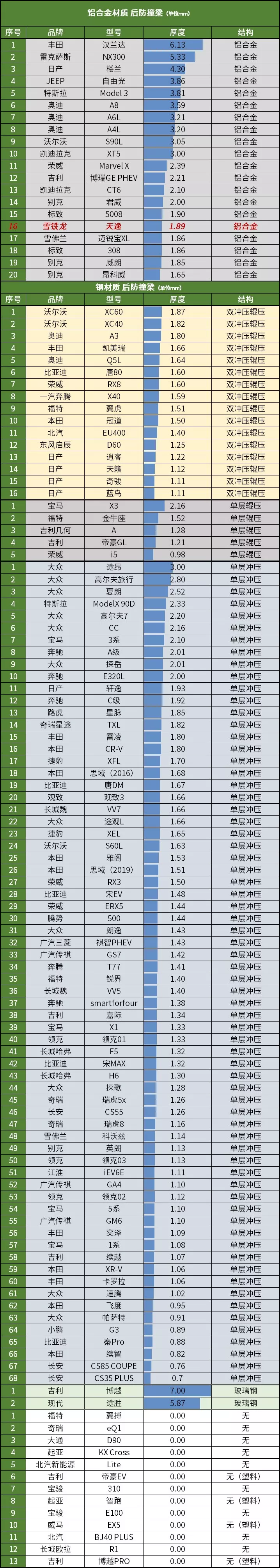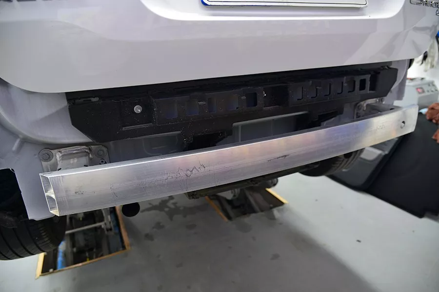 后防撞梁也是铝合金材质,也是“日”字形,厚度为1.89毫米,能覆盖62.4%的范围。