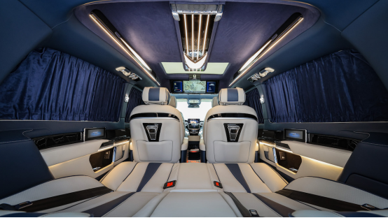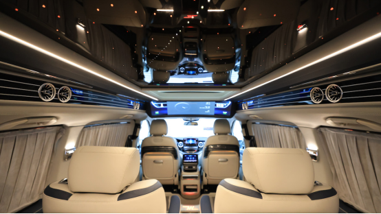 除此之外,卡兹莫众神款和海神款车型还拥有多功能起居空间,智能影音、电动窗帘、可调节氛围灯等豪华配置,坐在这台车里,真的会让人流连忘返总觉得这里才是高端出行的真实模样。