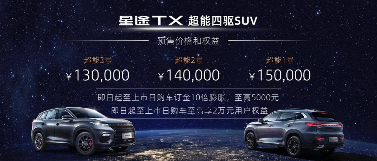 为满足驾驶爱好者的需求,星途TX在本次车展更是发布了“超能四驱版”。三款配置价格也是全面公布,超能3号预售价13万元、超能2号预售价14万元、超能1号预售价15万元。新车以动力、操控、四驱的核心产品优势,凭借领先同级的10大超能配置,将为以高水准驾控为乐趣的年轻“爱驾一族”带来超越期待的满分选择。