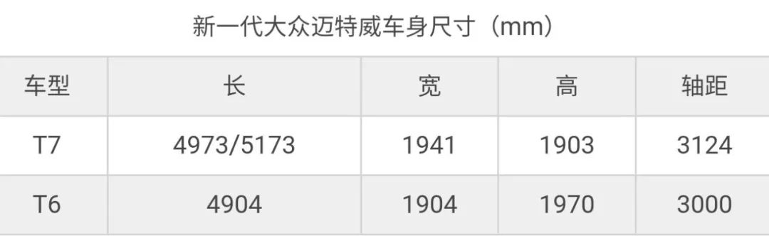 在车身尺寸方面,新迈特威分为长轴和短轴,长宽高分别为4973(5173)*1941*1903mm,无论长轴还是短轴,轴距都是3124mm。跟老款迈特威比起来,除了车身高度变矮了,其他都有相应的增加。