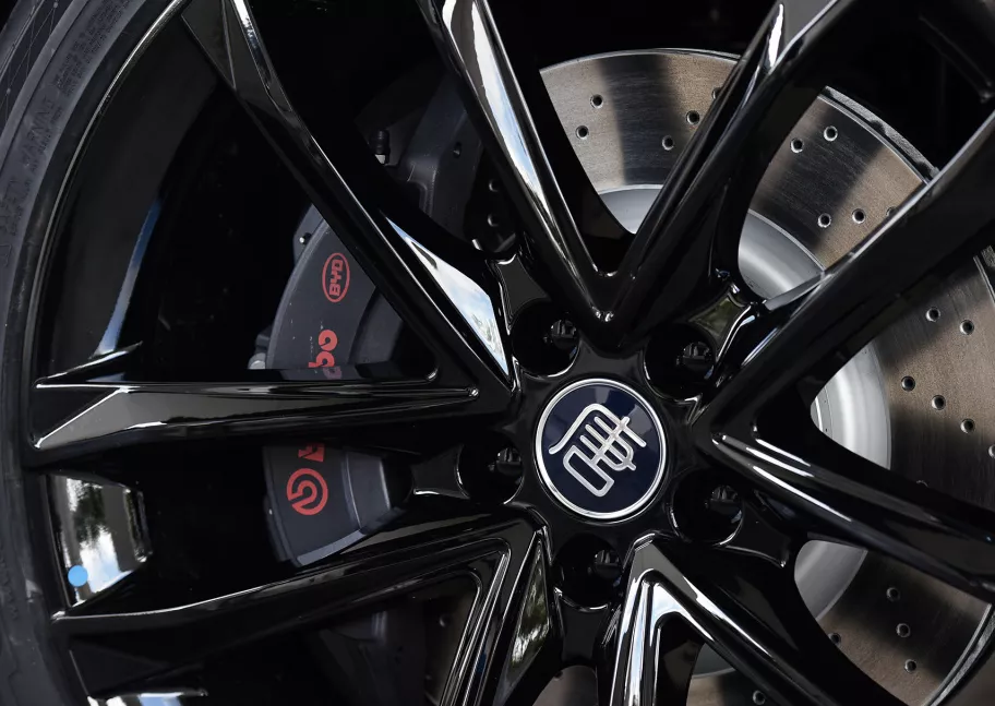 唐EV 四驱高性能尊荣版配备了Brembo高性能卡钳,22寸的黑色轮圈需要选装。