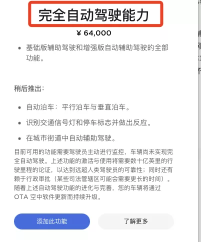Model Y可以选装“完全自动驾驶能力”,花6.4个w不是重点,重点是特斯拉的说法是“完全自动驾驶”,这说法第一是可笑,业界共识当下没有量产车辆能做到完全自动驾驶,特斯拉早先回应美国监管机构质询的说法是,“FSD是L2级自动驾驶辅助技术”,第二是不安全,万一有消费者听信“完全自动驾驶”这个宣传,出了事故谁负责呢?